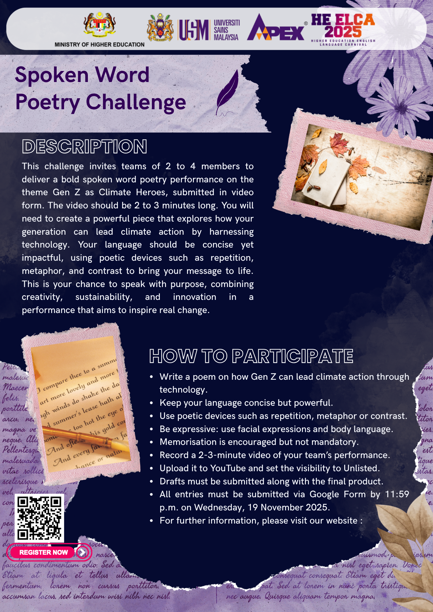 The top three teams will be selected to perform live at the finals in USM. A panel of judges will evaluate the performances based on language, delivery, theme relevance and group cohesion.